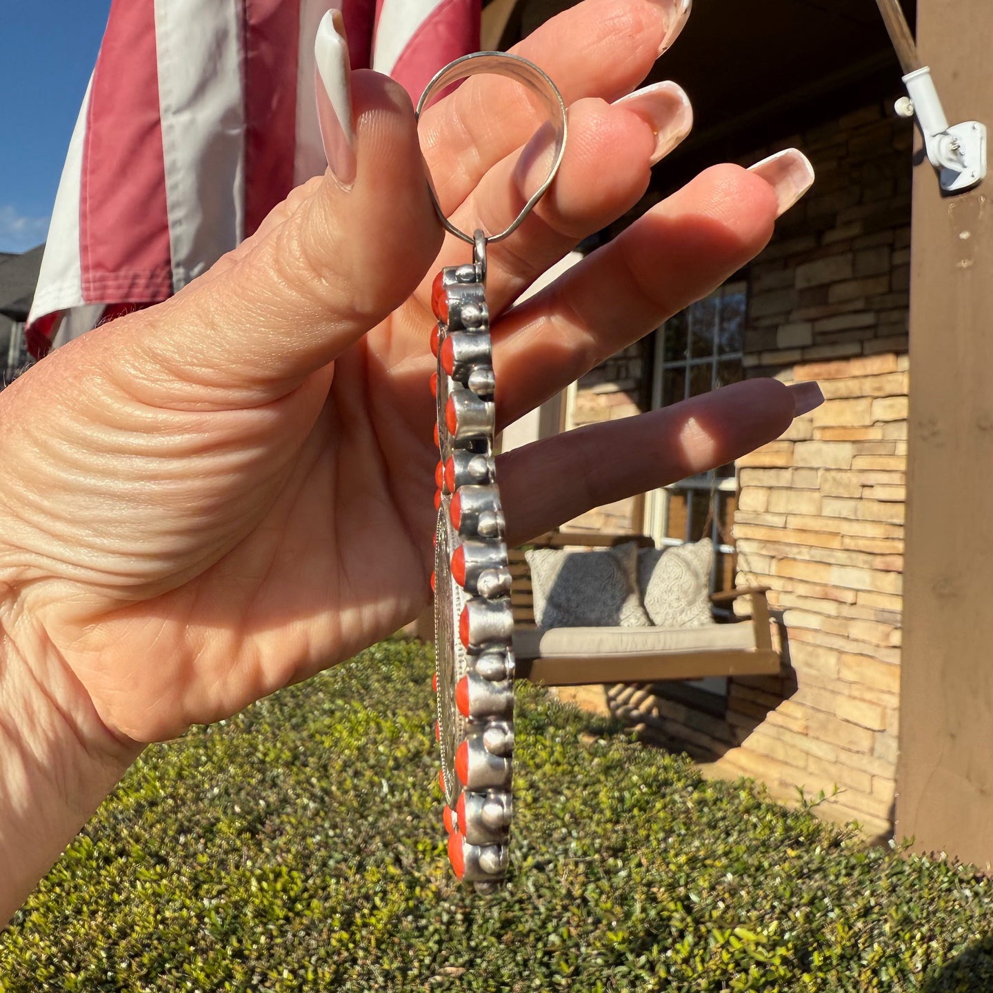 Betty 'Bea' Tom is a Navajo artist that is known for her cluster work, and this stunning statement coral coin cluster pendant is a wonderful example. Features a 1921 Morgan Dollar and 1945 Mercury Dime (coin silver - 90%) set in sterling and embraced with gorgeous coral cabs. Large bale to accommodate big beads.