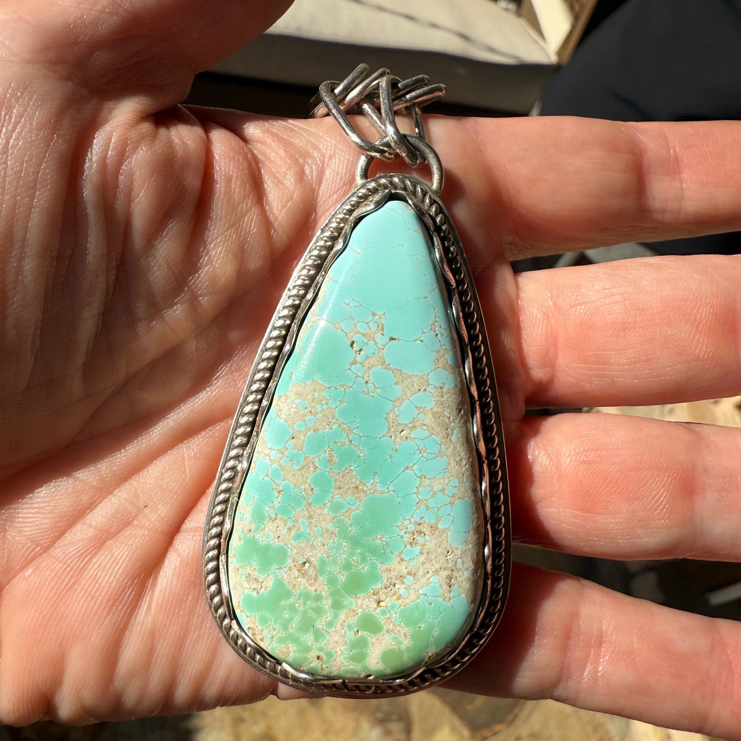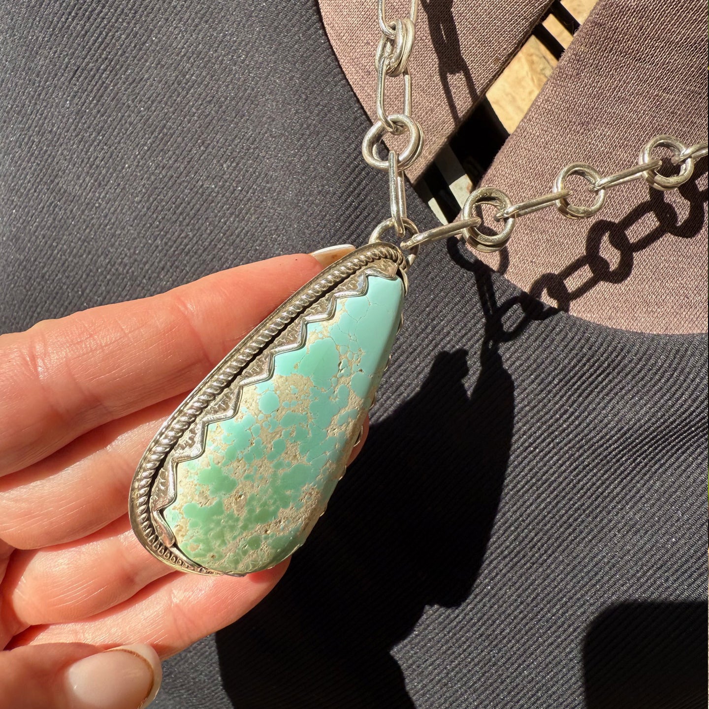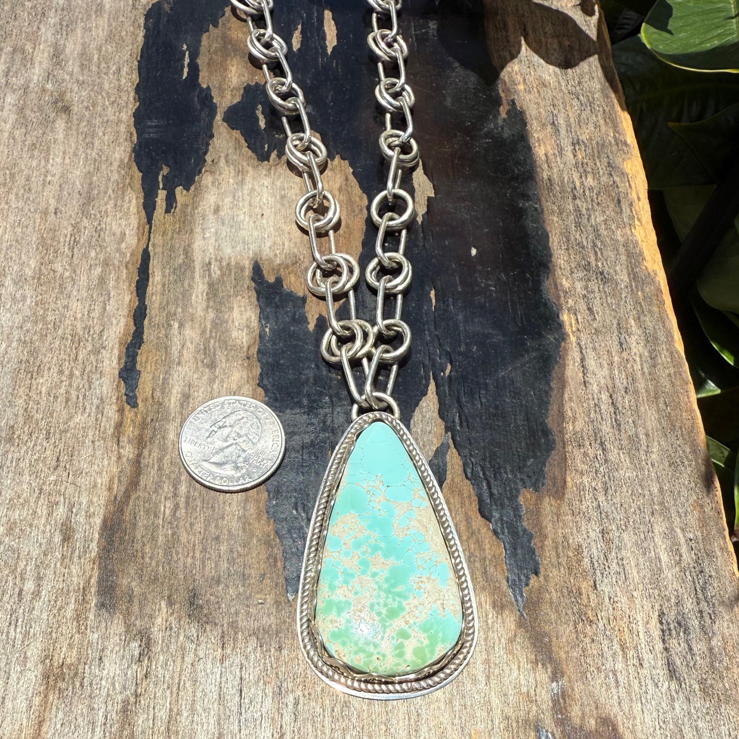 This one features a paperclip/round chain combo -- and an amazing cab of natural poly chrome Royston turquoise - pale cool blue and green. Stone measures 2 3/8" x 1 3/8" and including the silver it is 2.75" by 1.75". Chain is 18" and these pieces may be hooked and worn shorter.