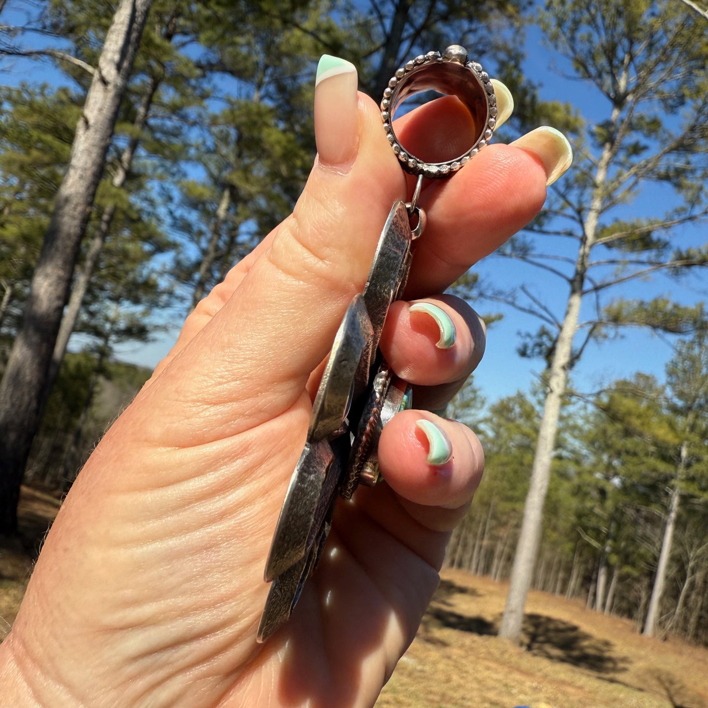 This pendant is a big, bold statement beauty and the talent that Myron uses to bring this silver to life is so impressive. This piece measures almost 4" long with bale included and is 3" wide.